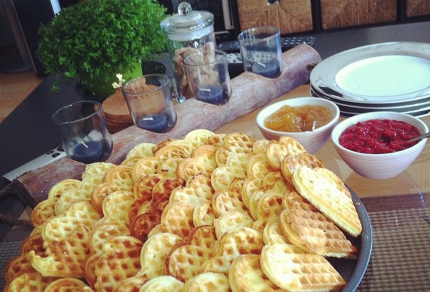 Denne røren blir veldig tykk, så pass på at du ikke har oppi for mye i vaffeljernet. Legg til avkjøling på en rist og del opp i enkelthjerter. Disse vaflene er like gode alene som med syltetøy! Kan oppbevares i en boks (om du ikke spiser opp alt!).