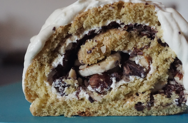 - Smør halve kremen på sukkerbunnen og strø på nøtter og sjokolade